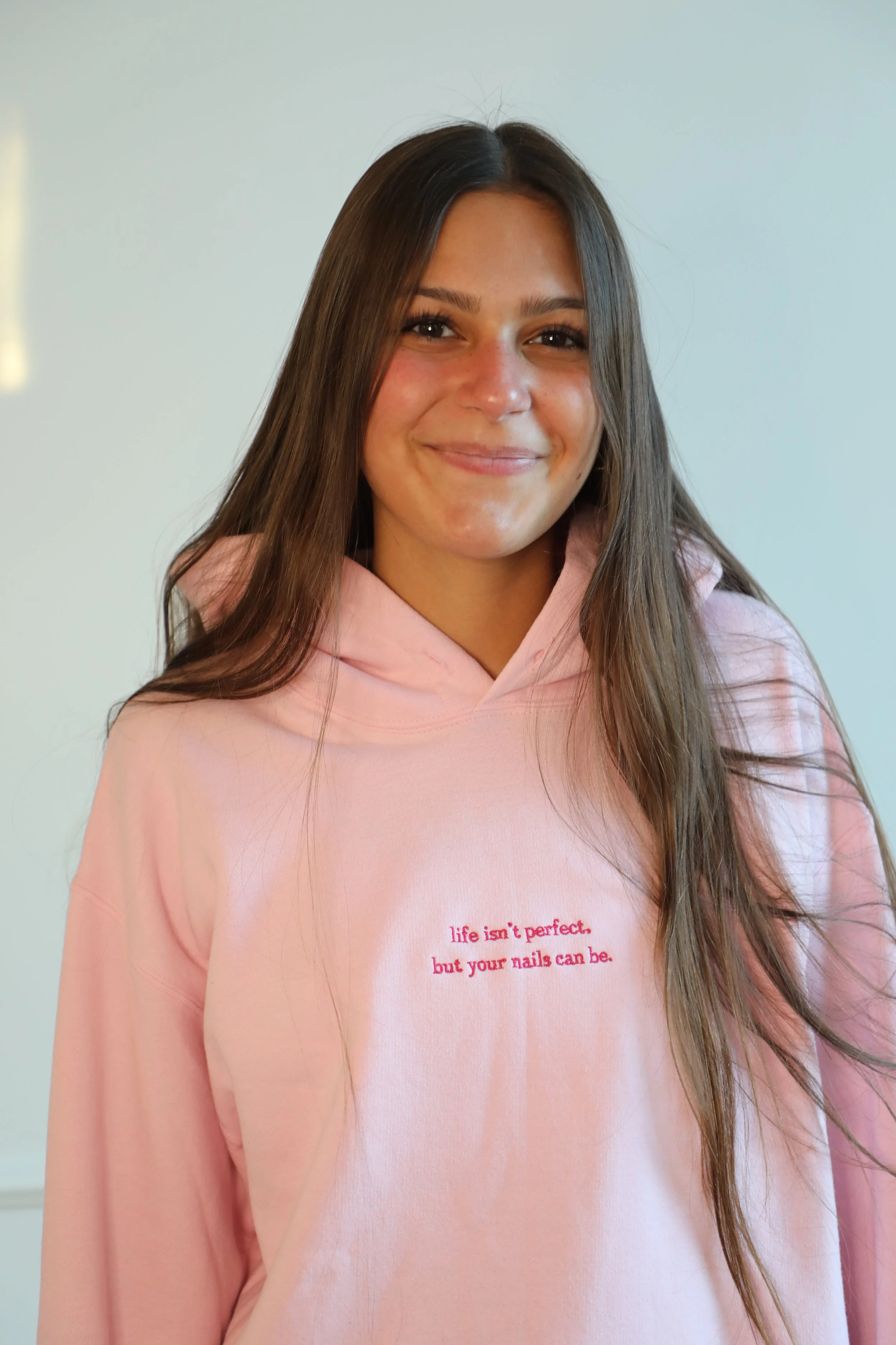 Lilli is wearing the “Life isn’t perfect, but your nails can be.” Embroidered Hoodie in a size M and in the color Light Pink