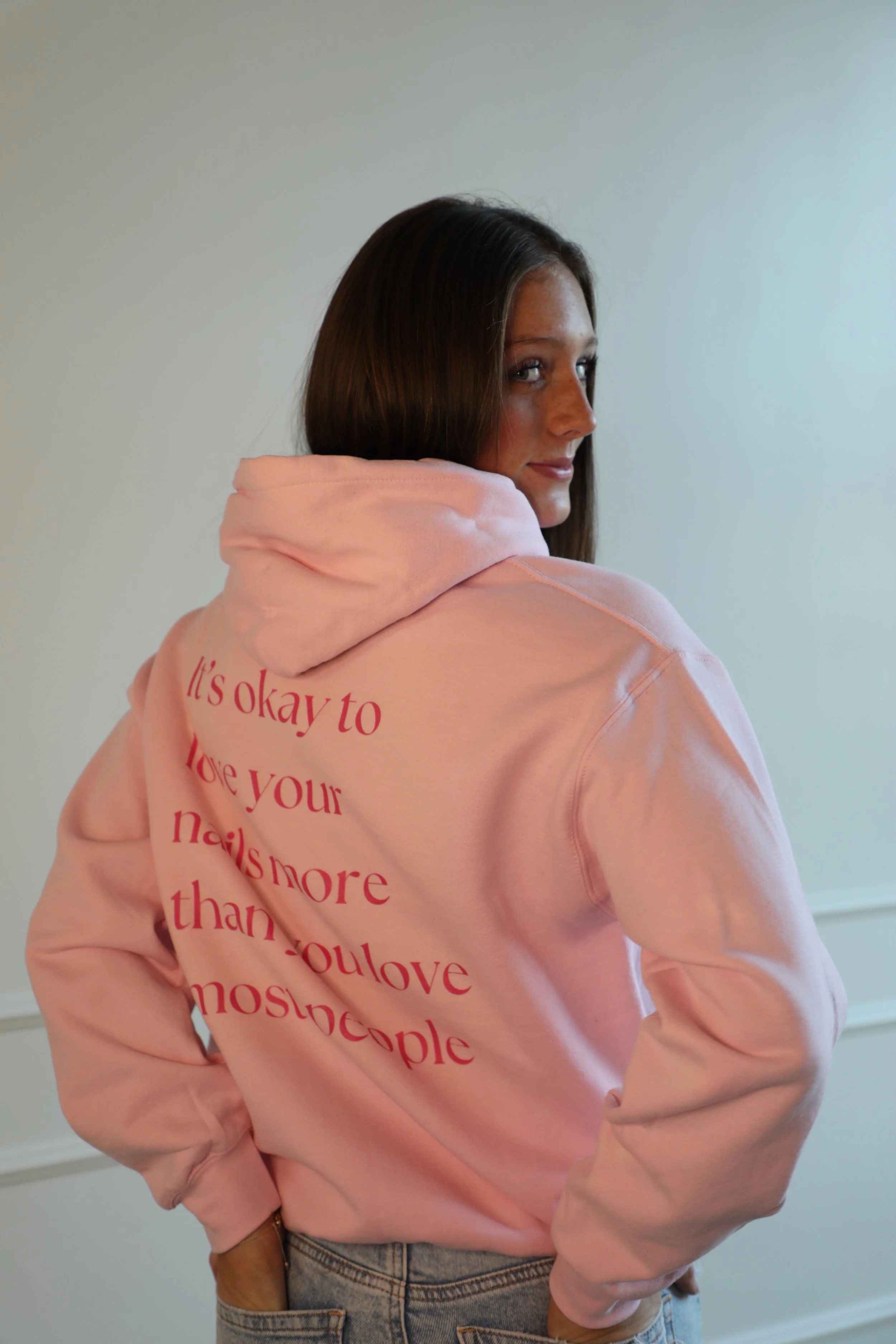 Lane is wearing the “It’s okay to love your nails more than you love most people.” Embroidered Hoodie in a size M and in the color Light Pink