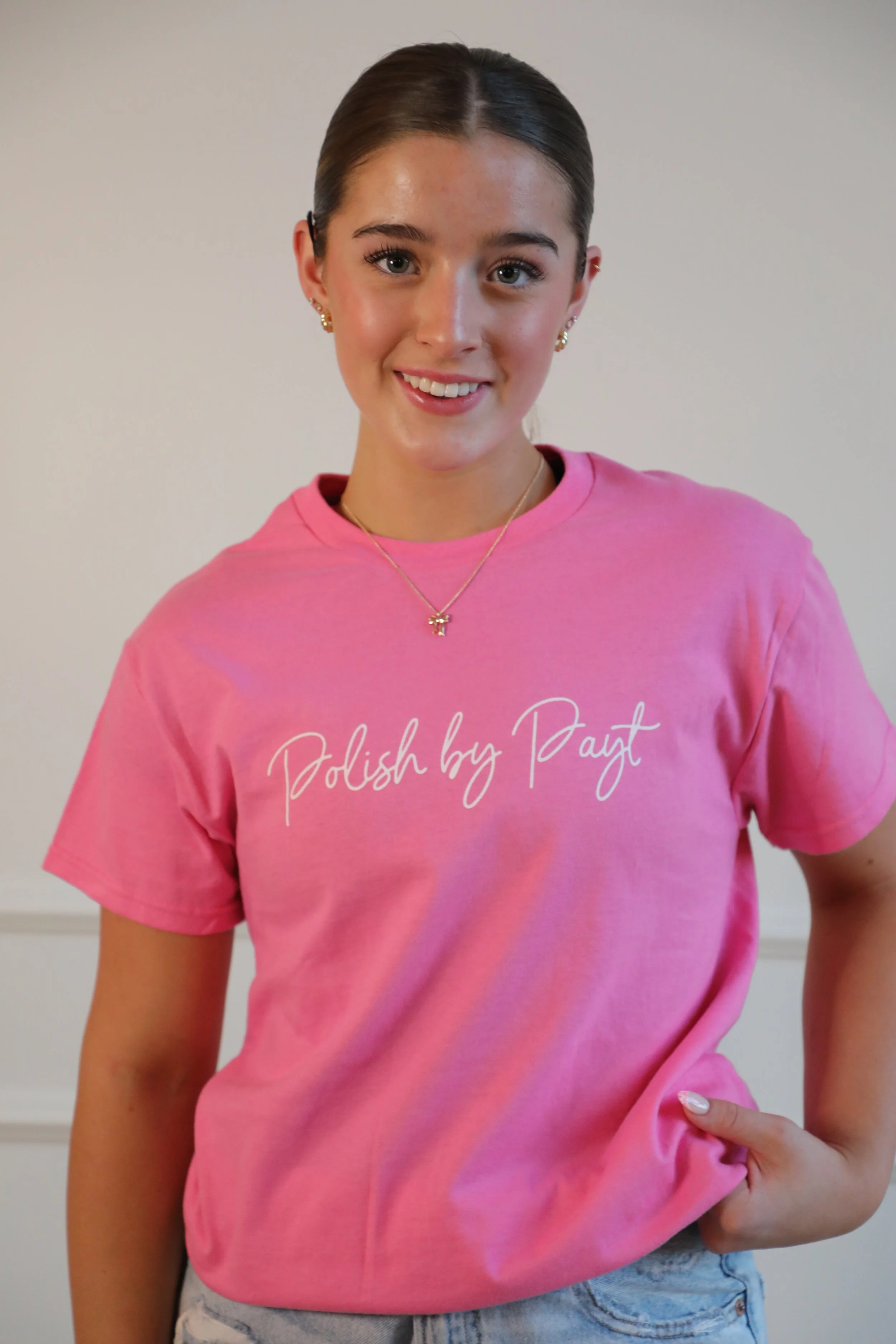 Kenzie is wearing the “Polish by Payt” Printed T-Shirt in a size S and in the color Azalea